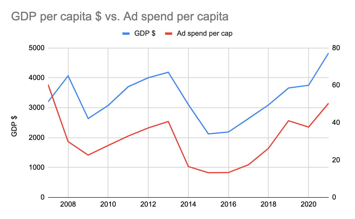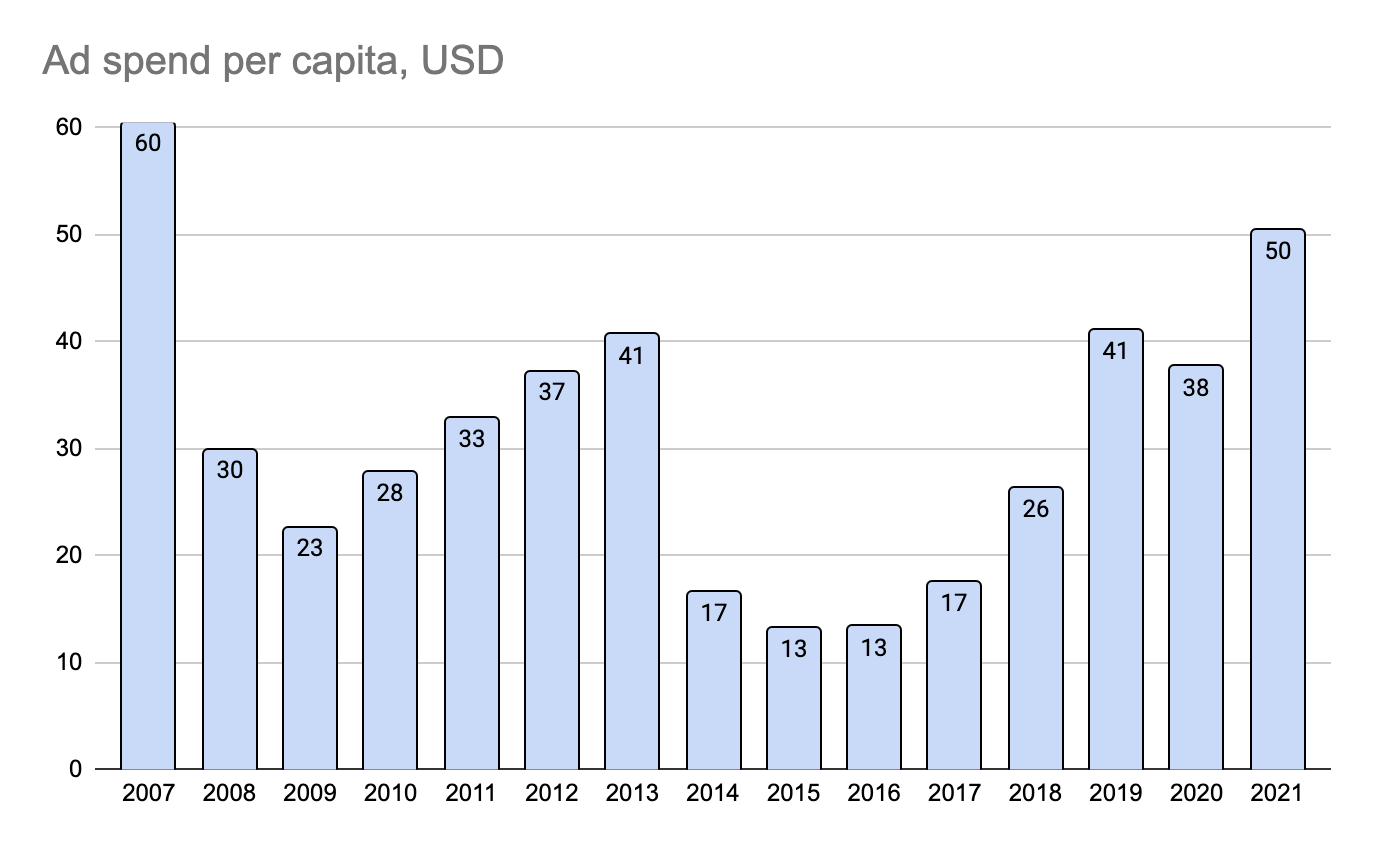 Цікавим є і інший показник, який ми можемо вивести з даних ВРК - витрати на рекламу на душу населення: