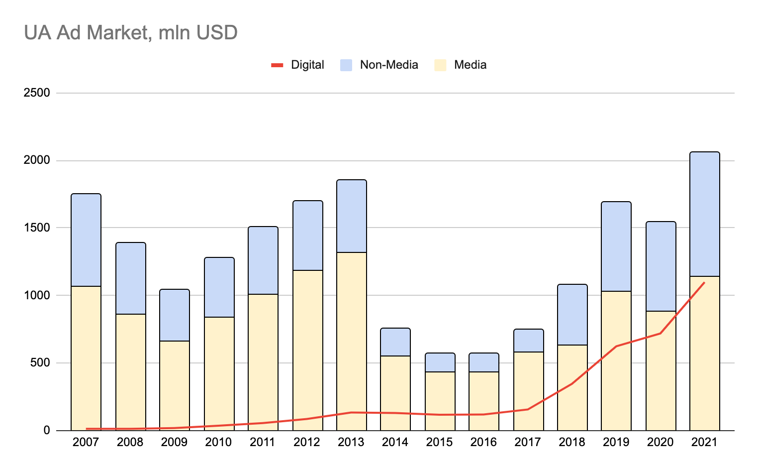 Як бачимо, ринок дуже волатильний, і результат 2012-2013 років за обсягами реклами в доларі нам вдалося перевершити лише в 2021 році. Ну і згадуючи події 2014-2015 років, можна зробити висновок про рекламний ринок цього року та найближчих 5 років.